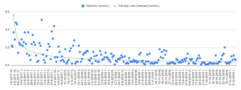 People who have been on a ketogenic diet for a while tend to measure lower ketones. The high values they measured at the beginning ranged somewhere around or above 2 mmol easily and the longer they are on this diet, the measured values hardly reach 1 mmol with only exceptionally a higher value but never as high as before where values above 3 or 4 were less exceptional. There are exceptions to this which I’ll briefly mention at the end.