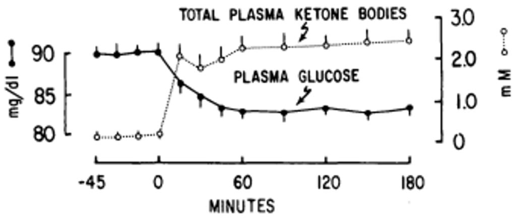 “Suppression of glucose production and stimulation of insulin secretion by physiological concentrations of ketone bodies in man”, Miles JM, Haymond MW, Gerich JE, 1981, https://www.ncbi.nlm.nih.gov/pubmed/7005257