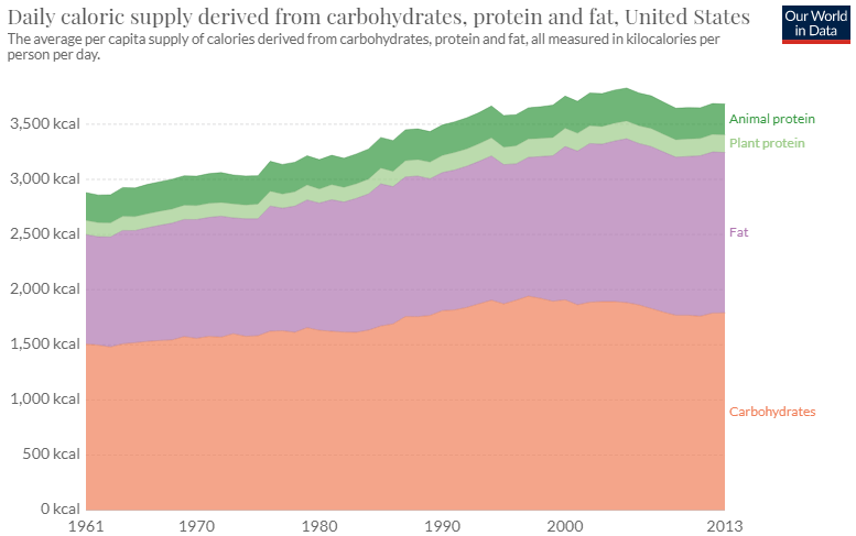 Across time we see that the quantity of protein consumed remains more or less the same yet carbohydrate and certainly fat content increases. Purely speculating on the slight increase in protein… this may be because we get more obese which results in larger skin mass and cells which all require protein to maintain them.