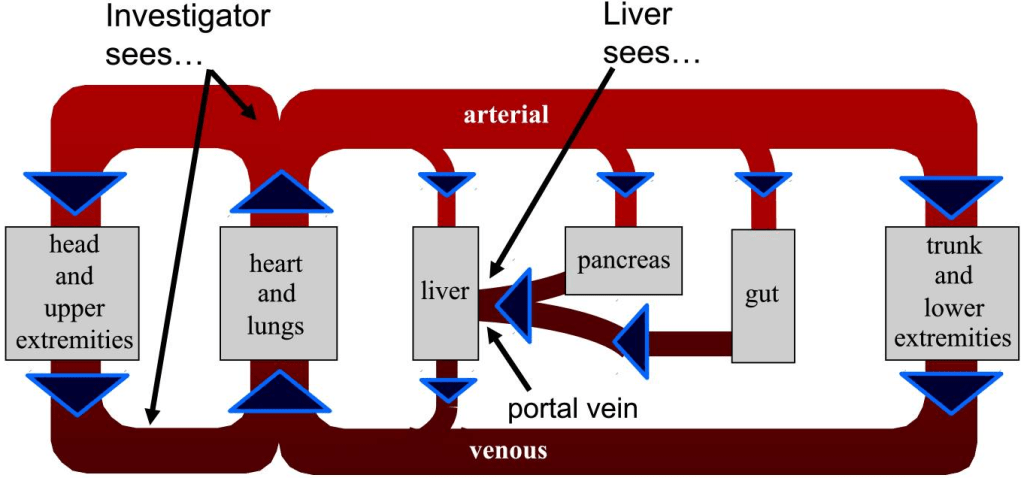 What you see on the simplified diagram is that the blood flowing out of the liver goes to the heart and lungs. From there it is spread into the arteries. Our upper extremities including the arms and head get the same supply. Although the head can be a big consumer of ketones, it does not ‘steal’ away ketones from the blood to then leave low ketone levels to the arm, where you measure your BHB level. Both the arms and head get the same fresh supply of blood.