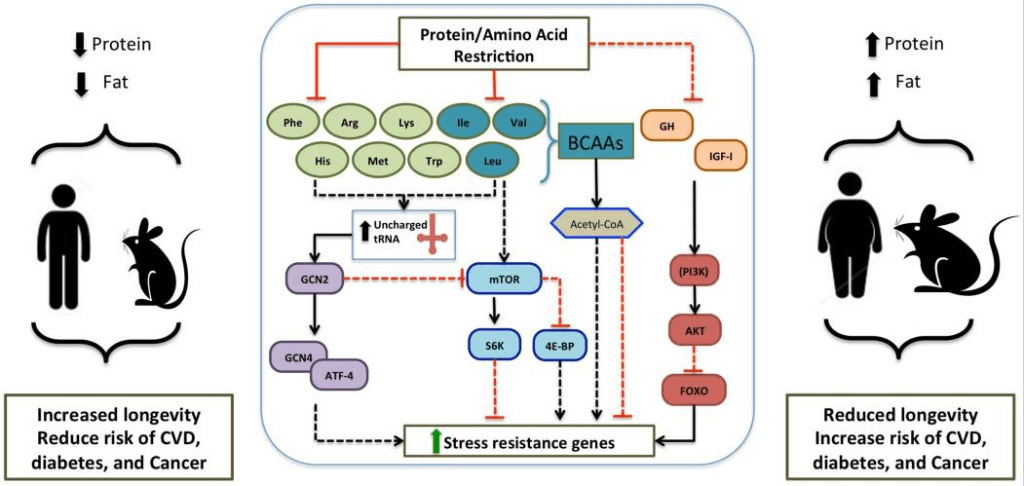 “Protein and Amino Acid Restriction, Aging and Disease: from yeast to humans” https://www.ncbi.nlm.nih.gov/pmc/articles/PMC4254277/