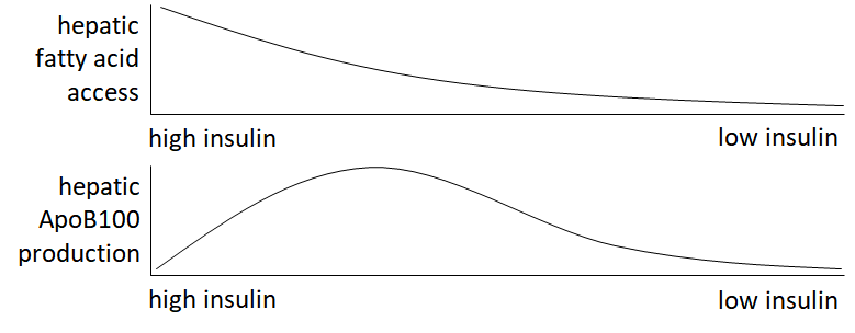 However, the ApoB100 production is not only depending on low insulin. It is also depending primarily on fatty acid access under this low insulin situation. The low insulin will cause a clearance of the stored fatty acids but as the level of this storage goes down, so will the ApoB100 production.