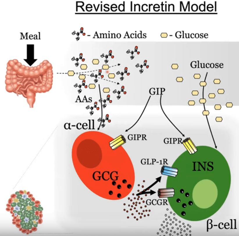 - When eating protein, GIP is released from the intestines. When the amino acids reach the alpha cell, together with GIP they stimulate glucagon release.