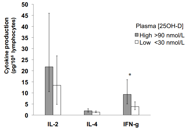 As you can see, those with sufficient vitamin D levels are able to produce more cytokines. Keep this in mind when reading further below the “Immune cells” section.