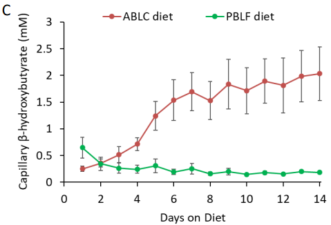In the first week we see an immediate jump up in dietary intake. During the first days BHB production is too low to help compensate for the drop in glucose. As BHB ramps up throughout the week we see the intake reduce. In the second week we see a marked lower intake versus the first week now that BHB has reached a meaningful level.