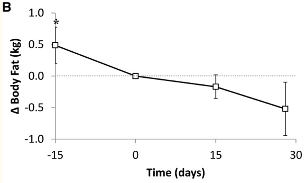 To further support the “transition period” with more evidence, the following study shows a longer trial of 30 days whereby we see an accelerating fat loss after 15 days. It was also conducted by Kevin Hall et all.