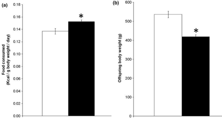 The development of a fetus during a period with inadequate maternal protein consumption has consequences for the offspring. This has been tested in Sprague-Dawley rats. What is interesting about this experiment is that the offspring rats had an increase in hunger, consuming more calories, yet at a lower body weight which the authors suspect is due to increased energy expenditure. This is a very big difference in energy expenditure. It is not eat more and weigh the same, but eat more and weigh less.