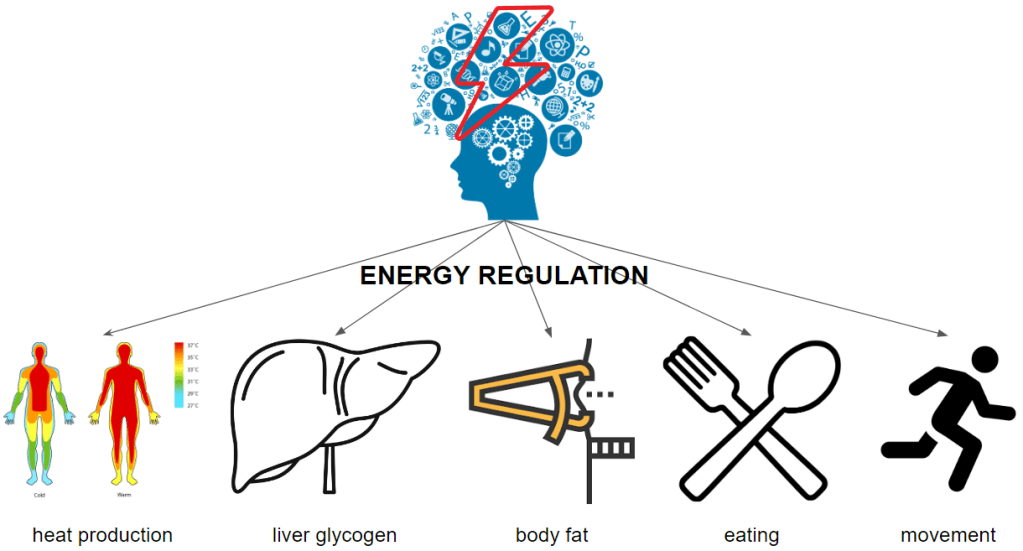 What happens if there is not enough energy? From the hypothalamus, nerve signals and hormones are secreted to regulate energy release from within the body storage, energy consumption by the body and external energy intake into the body.