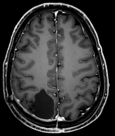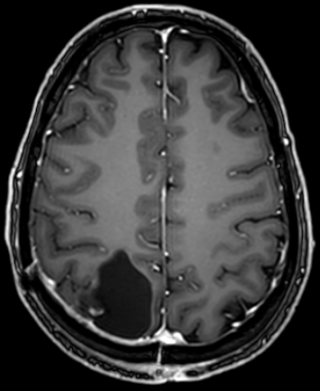 The first image is before surgery showing the tumor on the back side of the brain on the left.