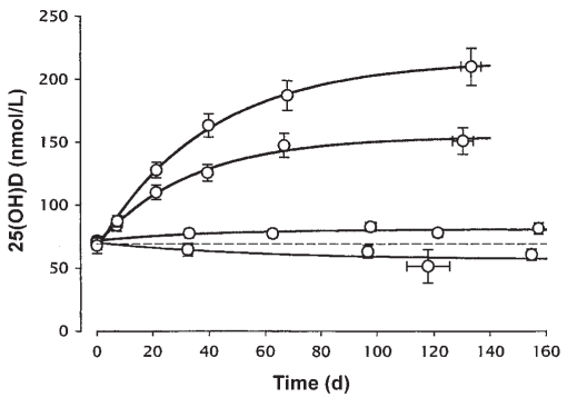 As you can see from the graph, it takes 4 months to reach the plateau of +/- 80 mg/dL with a daily dosage of 10 000 IU (250 microgr).