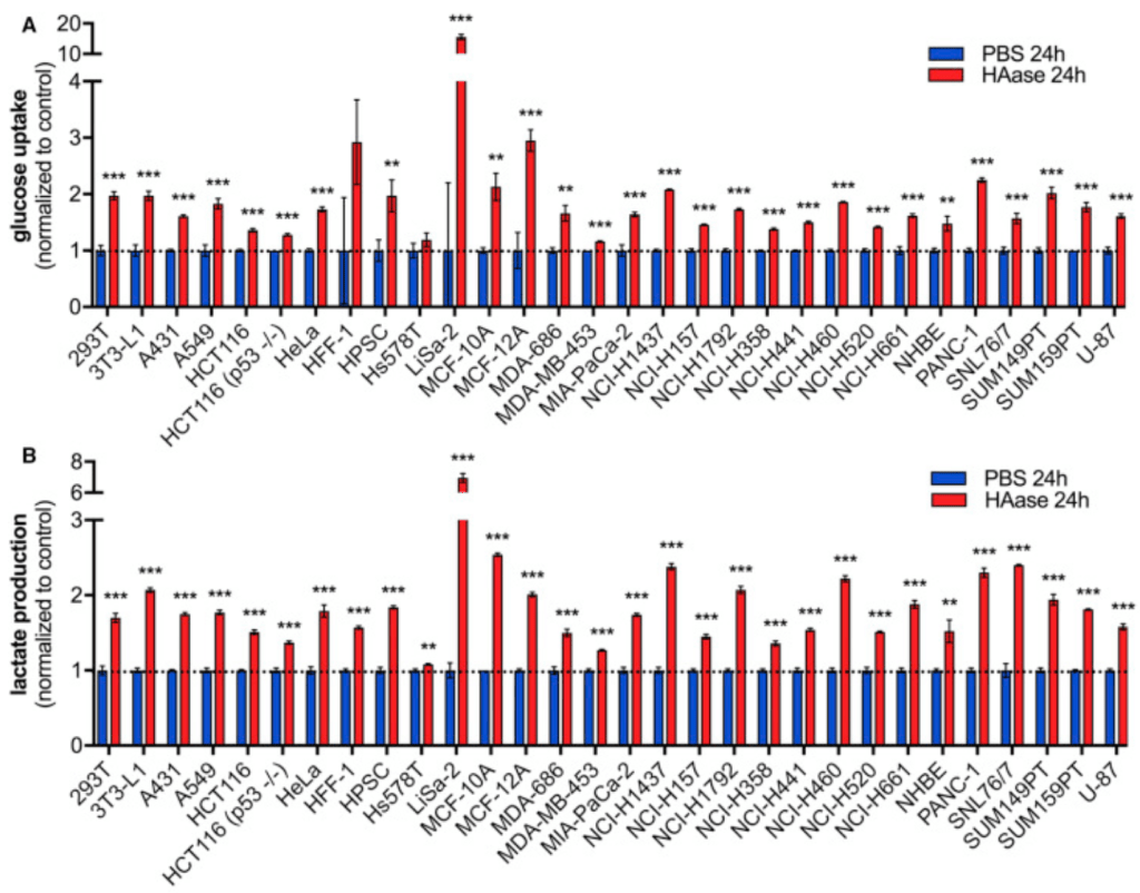 As you can see in the next picture, every single cell line they tested this with responds in a similar way, starting to increase glucose uptake and increase lactic acid production. They used primary, immortalized, murine, human cells, as well as cancer cells. A very diverse array of nuclear genetic material yet they are all responding.