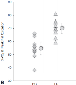 The figure above comes from people who were not fat adapted. They have their peak fat oxidation at around 55% of VO2Max. When we look at a study from Jeff Volek then we see that maximum fat oxidation can shifts towards a higher intensity. The high carb group shows the same results as before, max fat oxidation at 55% while the LC group (very low carb) reached the peak at 70%.