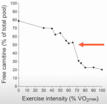 In short, at higher intensities there is not enough available carnitine to support the import of LCFA so that there is even a negative effect on its ability to import those fats.