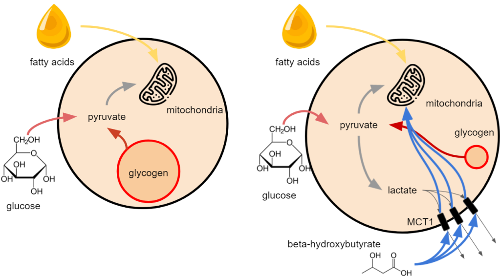 The result is that at very high intensities, glycogen will deplete faster on low carb. Circulating BHB will balance out this situation providing an alternative substrate for the TCA to increase mitochondrial ATP production.