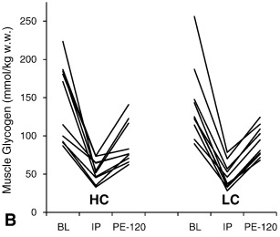 A nice experiment was done by looking at glycogen utilization between 2 legs in the same subject. 1 leg started with reduced glycogen while the other leg didn’t. They observed a 60% reduction from glycogen in the ‘reduced’ leg while it took up 30% more glucose. Because arterial supply was the same, this effect could be fully attributed to the glycogen level.