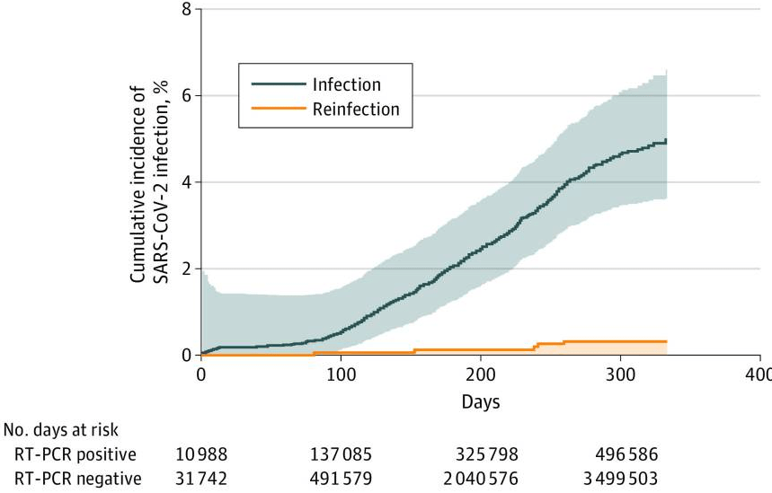 The study results suggest that reinfections are rare events and patients who have recovered from COVID-19 have a lower risk of reinfection. Natural immunity to SARS-CoV-2 appears to confer a protective effect for at least a year, which is similar to the protection reported in recent vaccine studies.