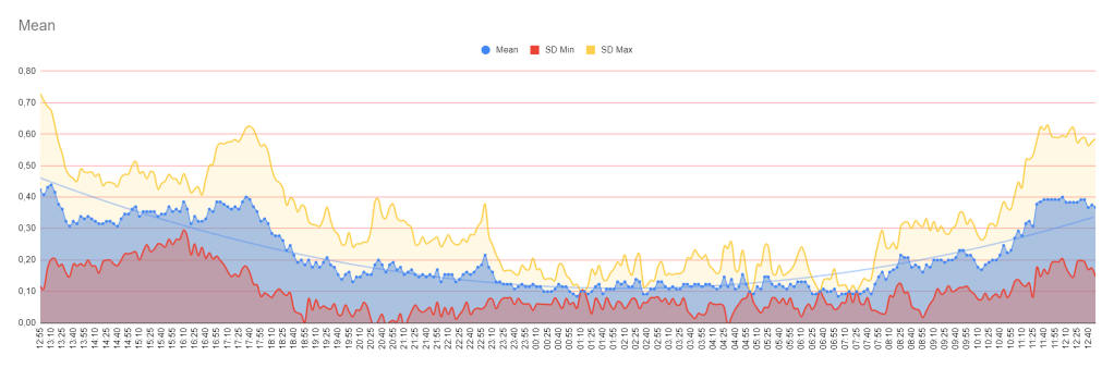 But also interesting is that the mean throughout the day seems to center between 0.3 and 0.4 mmol/L. This could be coincidence or this could be the value that my body is striving for. I’ve argued before on this thinking that ketones shouldn’t really be high and consider them rather like glucose where you have an ideal range and can handle the highs and lows just fine. It seems to be supported by Stephen Phinney by lowering his initial ketone target from 0.5 to 0.3 mmol/L but I cannot find a source other than someone commenting on it.